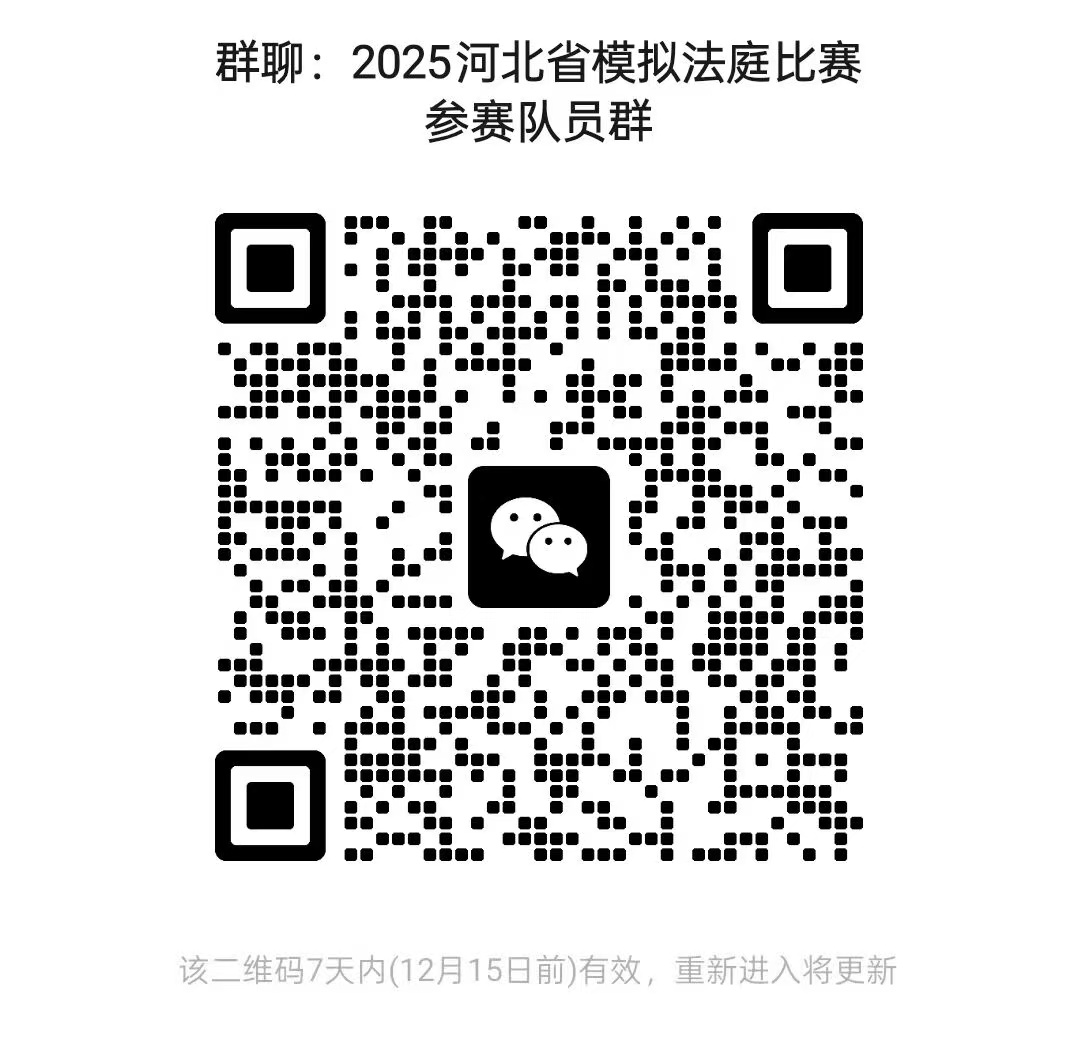 第一届河北高校模拟法庭辩论赛参赛人员群及带队教师群二维码如下,请各参赛队伍于2025年12月10日前加入微信群。