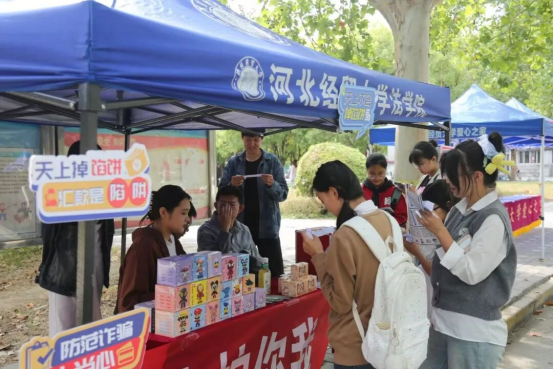 反诈知识答题环节,现场志愿者提前设置答题区,题目涵盖反诈法律常识、诈骗手段辨别等内容,题型丰富且贴近校园生活。同学们踊跃参与,认真思考作答,部分同学在答题后主动向志愿者咨询疑问,志愿者均逐一细致解答。活动为答题成绩优异的同学准备盲盒、定制书签等纪念奖品,既激发了大家的参与热情,也让反诈知识在互动中深入人心。
